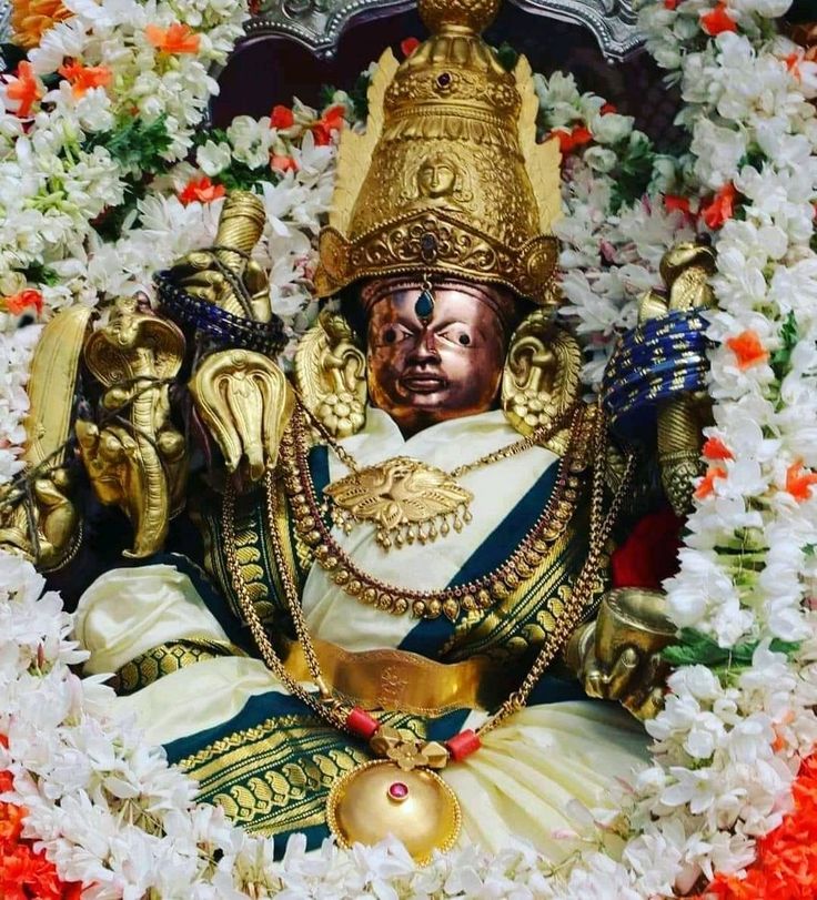 On the doorway of the entry tower is a little picture of Lord Ganesha. The Goddess is shown in several shapes on the silver-plated entryway. The images of 'Dwarapalakas,' or door-keepers, are on either side of the entry. As one enters, there is a little statue of Lord Ganesha, the remover of all obstacles, on the right-hand side. A flagstaff, the Goddess's footprints, and a miniature statue of Nandi face the sanctum sanctorum after a few steps. An image of ‘Anjaneya' is mounted to the wall on the right side, before approaching the flag staff. Nandini and Kamalini, two Dikpalakas, stand on either side of this entrance.